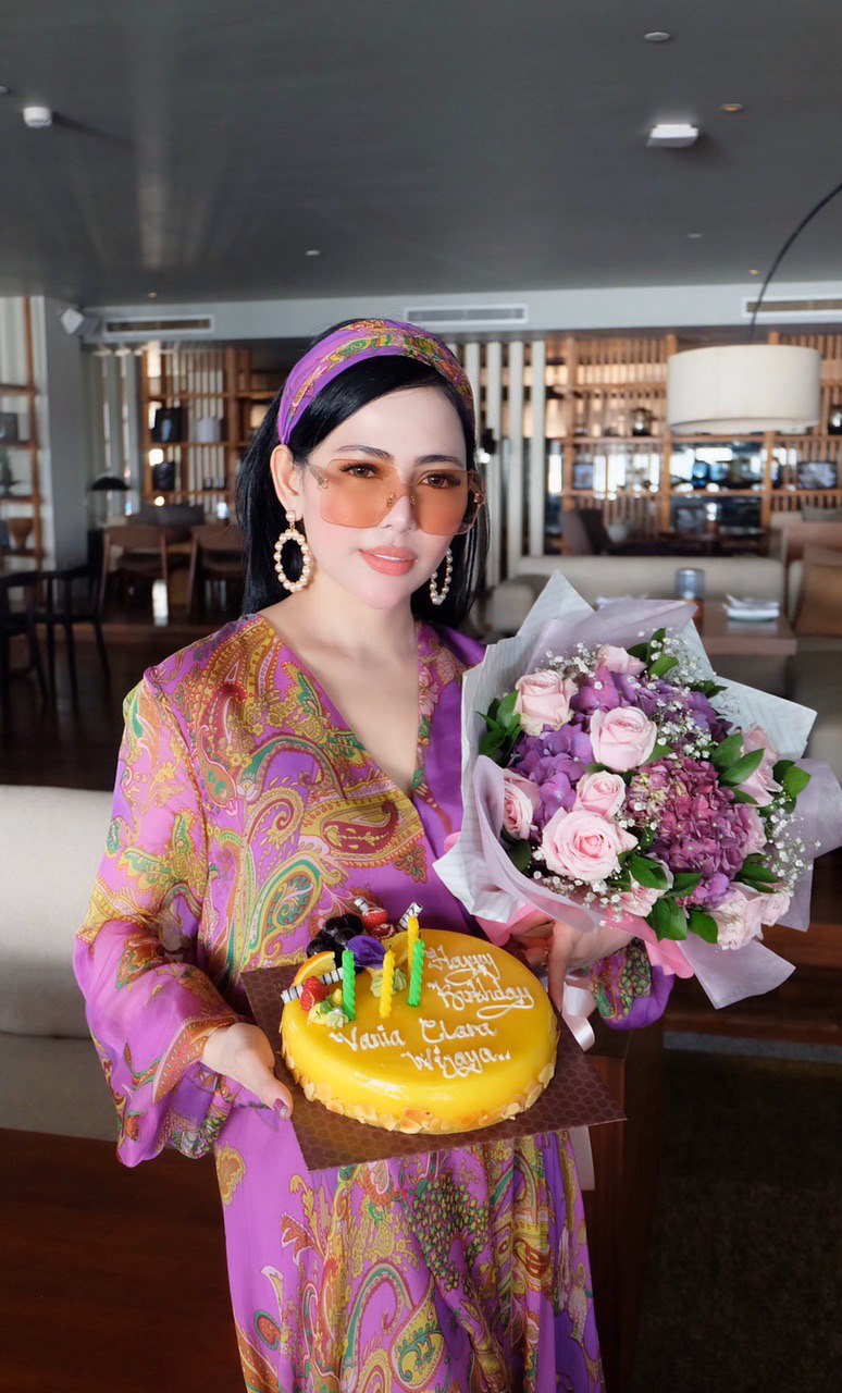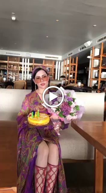 Dengan Kue ulang tahun bernuansa warna kuning dan perpaduan ungu menjadikan matching dengan gaya berpakaiannya yang fashionable, di tambah hadiah bunga yang sangat cantic membuat ia semakin terlihat  wanita perfect.